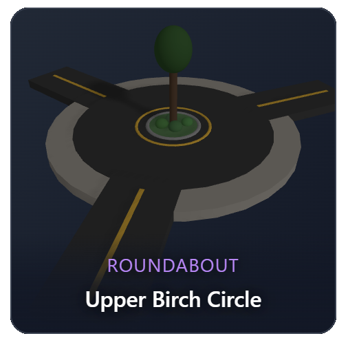 Roundabouts use a generator function to create their model - depending on the universe seed - and can have trees (or not), bushes (or not), and a variable number of roads out of them. They'll contain most of the things streets do.